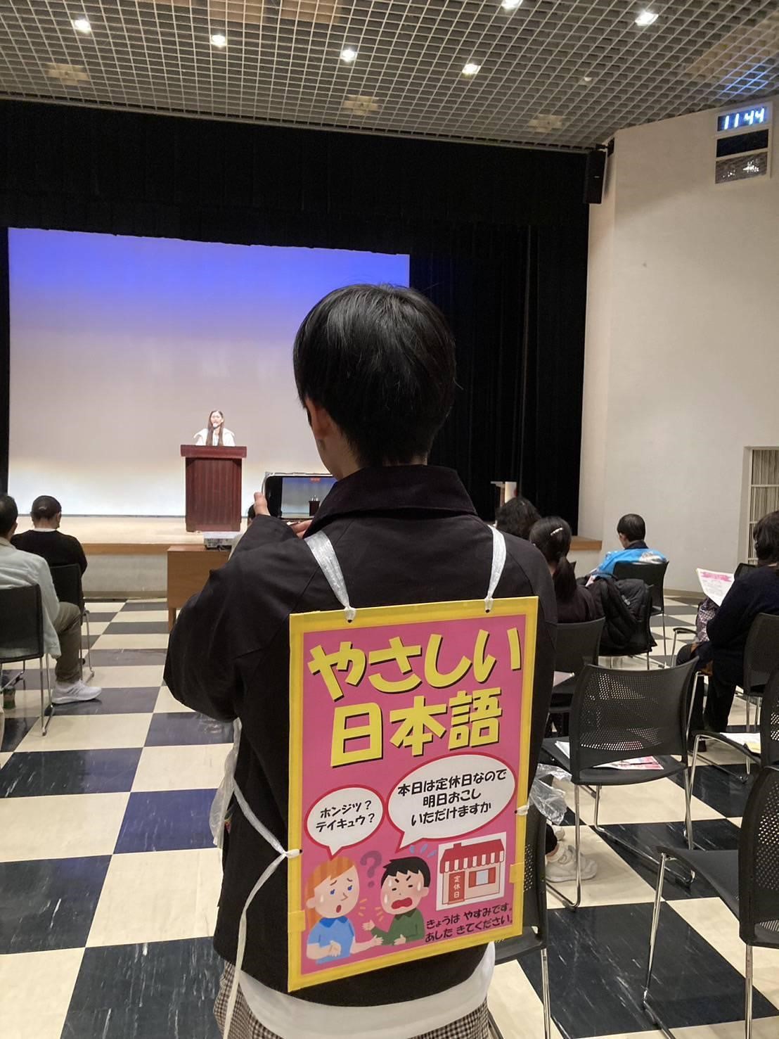 やさしい日本語を使ったレクリエーションとして、"トークフォークダンス"を行う。相手を変えながらお題に沿って自分の考えや思いを語り、日本人、外国人問わず会話で仲良くなり、交流を深める。